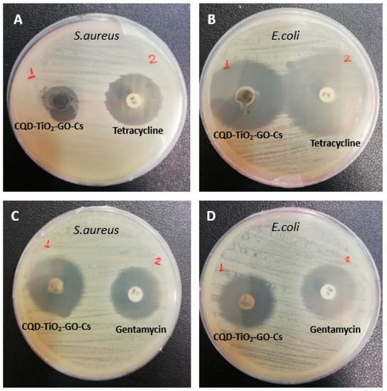 Previous studies have shown that Staphylococcus aureus bacteria are the main cause of wound infections [70]. Moreover, Escherichia coli bacteria are the common cause of burn wound infection [71]. Therefore, these bacteria can reduce the wound healing process [72]. The MIC concentrations of CQD-TiO2-GO-Cs NC were 0.2 mg·mL−1 for Staphylococcus aureus and 0.1 mg·mL−1 for Escherichia coli. The paper disc was impregnated with the NC at the above concentrations. Gentamicin and tetracycline discs were used as controls. The results in Figure 11A showed that the average halo diameter around the NC disk for S. aureus was 12 mm, and the halo diameter around the tetracycline antibiotic disk was 21 mm on average. As shown in Figure 11C, the inhibition zone of S. aureus around the sample and gentamicin antibiotic disk was approximately equal. In addition, the mean halo diameter around the NC disk in Figure 11B was 27 mm for E. coli, whereas the mean halo diameter around the tetracycline antibiotic disk was 29 mm. The gentamicin antibiotic and the NC disk’s inhibition zones created in Figure 11D were approximately equal. The antibacterial activity was more effective toward the Gram-negative E. coli than Gram-positive S. aureus bacteria, presumably because of their different cell wall structures [70].