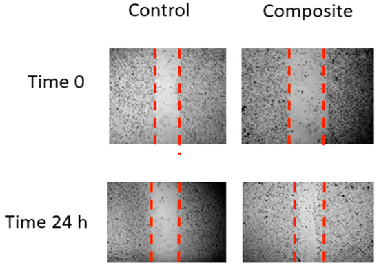 A scratch wound assay was carried out to determine whether the treatment of CS-CQD-TiO2-GO influenced cell migration and invasion. For the controlled cells, considerable cell migration was seen after 24 h, as illustrated in Figure 12. However, after being treated with CS-CQD-TiO2-GO, injured NIH3T3 fibroblast mouse cell monolayers swiftly healed the gap over the course of 24 h, just like in the control group.