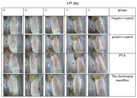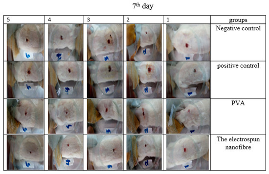 By injecting 10 mg kg−1 (body weight) of ketamine and xylazine intraperitoneally while the rats were under anesthesia, the dorsal area of their bodies was shaved from the scapula to the ileum, leaving a shear wound that measured 20 mm × 20 mm. They were then split into 4 groups, non-treated rats, phenytoin-treated rats, PVA-treated rats, and CS-CQD-TiO2-GO electrospun fiber-treated rats. The first day following wound induction, treatment was begun; topically applied polymers were used, and the wounds were treated. On the seventh and fourteenth days, all groups’ wounds were inspected and photographed. Finally, the affected region was cleaned, captured on camera, and estimated with ImageJ software (version 1.44 p). The following formula was used to calculate the wound healing rate [9]:
