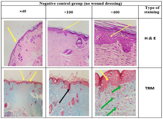 Microscopic imaging of skin tissue sections stained by two types of H&E and TRM dyes. The photo shows improved skin tissue 14 days after treatment in the non-wound dressing group. Yellow arrows indicate the formation of an epidermal layer in the tissue repaired with phenytoin, and also the green arrows indicate the penetration of inflammatory cells into the repaired tissue. Black arrow indicates dead cells in the tissue.