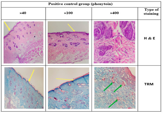 Microscopic imaging of improved tissue incisions 14 days after treatment in the positive control group (phenytoin). The yellow arrows indicate the formation of an epidermal layer in the repaired tissue that is treated with phenytoin, and the green arrows indicate the penetration of inflammatory cells into the repaired tissue.