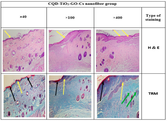 Microscopic imaging of improved tissue incisions 14 days after treatment with CQD-TiO2-GO-Cs nanofiber. Yellow arrows indicate the formation of an epidermal layer in the restored tissue treated with CQD-TiO2-GO-Cs nanofiber, and black arrows indicate dead cells in the tissue. Additionally, the green arrows indicate the penetration of inflammatory cells into the repaired tissue.