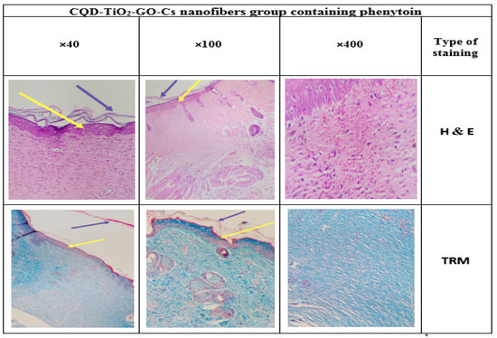 Different epidermis layers can be well identified in the histological images in Figure 17, Figure 18, Figure 19 and Figure 20. To evaluate the effects of the CS-CQD-TiO2-GO nanofiber on the skin of injured mice, the wound skin tissue was examined in four groups after 14 days of treatment. The histology of all samples was examined by staining with H&E and TRM dyes. A similar method was performed by Bolle et al. [76] and Murphy et al. [77]. The negative control group included samples not receiving any treatment (Figure 17). The positive control group included the group treated with phenytoin (Figure 18). Figure 19 shows the group treated with the CS-CQD-TiO2-GO nanofiber and the last group treated with the CS-CQD-TiO2-GO nanofiber containing phenytoin (Figure 20). According to the results obtained from microscopic imaging of the four treatment groups and their comparison with each other, the wound healing stages in the CS-CQD-TiO2-GO nanofiber group containing phenytoin were more comprehensive than in the other three groups. This group also had an inflammatory response within 14 days after wound healing. It gradually decreased in this group, and dead cells in the tissue were much less seen than in the other groups, and creatine formation was observed on the fourteenth day.