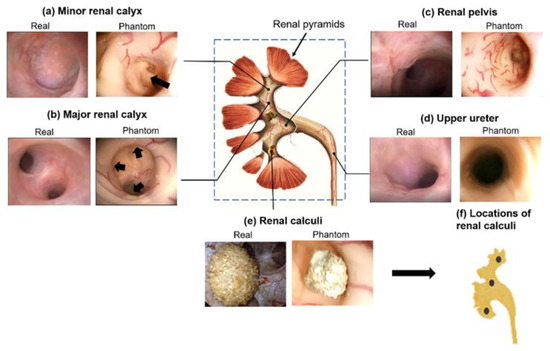 The validation of the soft endourological phantom using ureteroscopy. (a–e) Different anatomical sections are compared with real human endoscopic images. Black arrows in (a,b) refer to the renal papillae and minor calyces, respectively. The real renal calculus picture in (e) is obtained from [24] with permission. (f) Corresponding locations of three renal calculus in the proposed kidney model.