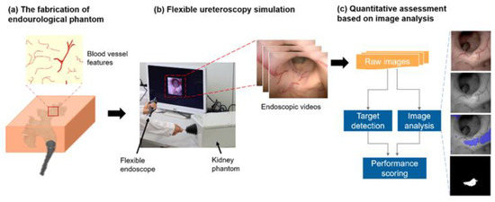 Minimally invasive surgical endoscopy is becoming prevalent across many other procedural and operative specialties, for example, in the department of urology. Since the first visualization of the upper urinary tract in 1929 [1,2], the use of flexible ureteroscopy (fURS) dramatical increased, for instance, by 83% from 1994 to 2004 [3]. However, postoperative complications (i.e., tissue wall injury, bleeding, and infection) following ureteroscopy procedures are not negligible [4,5] and constitute a serious public health problem [6]. It is, therefore, important to increase the surgeon’s experience to decrease the risk of severe complications of fURS [7]. Surgical training on surgical simulators in vitro is thus required by clinicians with hands-on opportunities to practice procedures and devices in a safe environment.