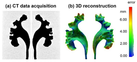 The 3D shape of the collecting system was validated by comparing two CT scans: the human cadaver kidney reference and the fabricated phantom. For the verification of the resemblance, we used CT scanning, similar to human kidney imaging, as reported in [21]. The CT scan (Somatom Force, Siemens, Erlangen, Germany) of the phantom was carried out without a contrast agent due to high image contrast between the silicone material of the phantom and the air. The shape of the collecting system in the phantom with the stones was 3D reconstructed and exported as a .stl file (InVesalius v3.1.1, Renato Archer Information Technology Center, Campinas, Brazil). The mesh of the collecting system phantom was then aligned and compared with that of the human collecting system by computing the point-to-point distances between the two cloud points in the software (CloudCompare v2.11, Telecom ParisTech and the R&D division of EDF, Paris, France). A pseudo-color image was displayed to show the spatial errors of the phantom compared to the original design as a reference.