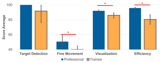 The overall scores of endoscopic skills, including target detection, fine movement, visualization, and efficiency. The error bars represent standard deviations, and * indicates statistical difference where p < 0.01.
