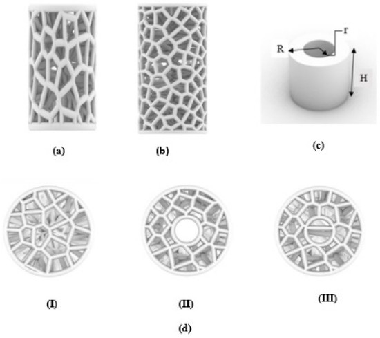 - Zhao, H.; Han, Y.; Pan, C.; Yang, D.; Wang, H.; Wang, T.; Zeng, X.; Su, P. Design and mechanical properties verification of gradient voronoi scaffold for bone tissue engineering. Micromachines 2021, 12, 664. [Google Scholar] [CrossRef]