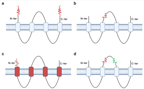 Sketch of commonly used VLP genetic engineering modification strategies (here multi-process membrane proteins are used as examples). (a) N/C-ter adjunction; (b) Exposed-loops insertion; (c) TM/CT grafting; (d) Multi-domain assembly.