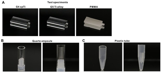 Test specimens and containers used in this study. (A) Test specimens made of different materials. (B) An ampoule made of synthetic quartz. A grade 4 titanium specimen placed in the quartz ampoule (right panel). (C) A laboratory-grade clear plastic tube. A grade 4 titanium specimen placed in the plastic tube (right panel).