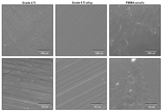 Low- and high-magnification SEM images of grade 4 titanium and grade 5 titanium alloy specimens showed a similar texture with line traces and minor irregularities made by machined turning (Figure 2). PMMA acrylic specimens showed a slight wavy morphology with scratches and irregularities made by milling.