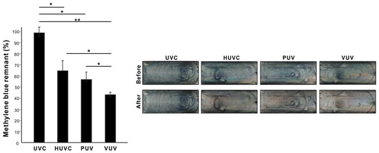 UV-mediated decomposition of methylene blue by various UV sources. Grade 4 titanium specimens coated with methylene blue were placed in quartz ampoules and treated with UV light for one minute. Four different UV light sources were used: (1) UVC from a low-pressure mercury lamp (UVC); (2) high-energy UVC (HUVC); (3) a UV device with a proprietary protocol (PUV); and 4) 172 nm vacuum UV (VUV). A histogram showing remnant methylene blue after UV treatment (%). Photographs of methylene blue-coated titanium specimens before and after UV treatment are also shown. * p < 0.05, ** p < 0.01.