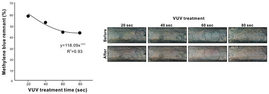 Dose-dependency and optimization of VUV-mediated organic decomposition. Methylene blue-coated grade 4 titanium specimens in quartz ampoules were treated with VUV for various treatment times from 20 to 80 s. The remaining methylene blue was quantified and plotted against UV treatment time and showed a highly fitted, negative exponential curve. Photographs of methylene blue-coated grade 4 titanium specimens before and after VUV treatment are shown.