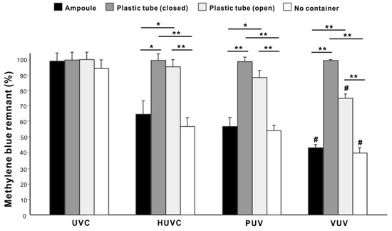 We next studied the suitability of quartz ampoules for containing specimens for VUV-mediated organic decomposition. Regardless of the UV light source, there was no significant methylene blue decomposition on titanium specimens placed in laboratory-grade plastic tubes with lids (closed) (Figure 5) but some methylene blue decomposition on titanium specimens in plastic tubes without lids (open), with VUV the most effective UV source (p < 0.05; Figure 5). There was significantly more residual methylene blue on specimens treated in open plastic tubes than in quartz ampoules for HUVC, PUV, and VUV (p < 0.05). Although there was a trend towards slightly higher organic decomposition on titanium specimens not placed in containers than those in quartz ampoules, the differences were not significant for all UV light sources. Therefore, quartz ampoules do not significantly compromise organic decomposition compared with direct exposure (Figure 5).