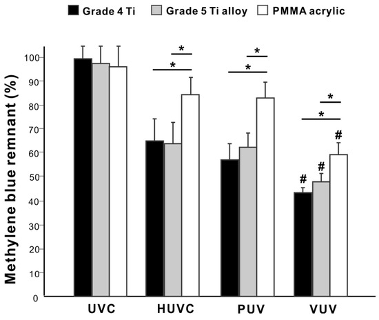 Effects of different materials on UV-mediated organic decomposition. Specimens made from grade 4 titanium, grade 5 titanium alloy, and polymethyl methacrylate (PMMA) resin were compared. A histogram showing remnant methylene blue after one minute of UV treatment (%). * p < 0.05, # p < 0.05, statistically different between VUV and other light sources.