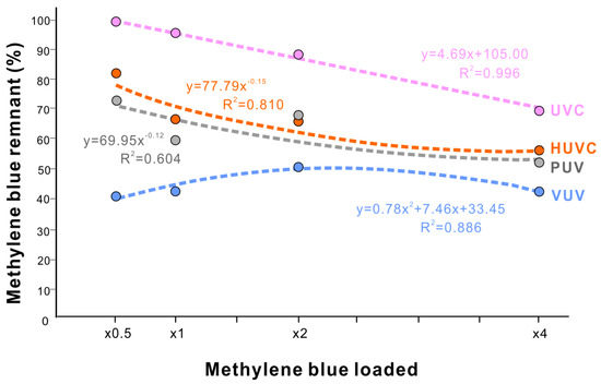 Load testing of organic decomposition by four different UV light sources. Methylene blue at four different concentrations (0.5-times to 4-times the standard concentration used in other experiments) in a quartz ampoule treated with UV light sources for 1 min. Remnant methylene blue is plotted against the methylene blue concentration along with results of the regression analysis. Note that all regression curves move up as methylene blue loading was less except VUV light.
