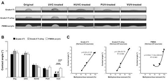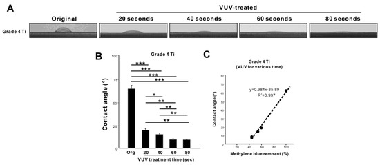 Hydrophilicity/hydrophobicity of grade 4 titanium specimens and its association with organic decomposition. (A) Side-view photographs of 3 µL ddH2O placed on grade 4 titanium specimens before and after VUV treatment for various treatment times. (B) A histogram showing the contact angle measured using the images in panel A. * p < 0.05, ** p < 0.01, *** p < 0.001. (C) A graph plotting the contact angles obtained from panel B and residual methylene blue obtained from experiments using VUV (Figure 3), along with correlation lines and equations obtained from regression analyses.