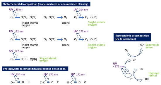 The rapid and efficient organic decomposition mediated by VUV can be explained by two main UV-mediated carbon molecule decomposition mechanisms: photolytic decomposition and photocatalytic decomposition, the former subdivided into photochemical and photophysical decomposition (Figure 10). Our study showed that, given the rapid and efficient organic decomposition by UV light sources, there is a significant contribution from photolysis. Photocatalysis occurs through interactions between UV light and titanium dioxide, and it is exploited extensively in the environmental sciences and other technologies. The advantage of photocatalysis is that it is triggered by low-energy UV light and applicable to a large surface area. While the effect is slow, it can be continuous throughout the irradiated period, useful, for example, for cleaning rooms and walls. We detected that photocatalytic decomposition contributed 20–25% of the overall effect of HUVC, PUV, and VUV, as shown in the difference between titanium and PMMA specimens (Figure 6), and there was little difference in contribution of photocatalytic decomposition between HUVC, PUV, and VUV sources. We also hypothesized that the high-energy 172 nm VUV rays directly increased the speed and capacity of organic decomposition. As shown in Figure 10, 172 nm VUV light has significant photochemical and photophysical decomposition advantages. A 172 nm UV ray can rapidly produce more reactive oxygen due to exclusive non-ozone-mediated reactive oxygen production, which attacks organic molecules. Furthermore, due to is higher energy, 172 nm UV can directly dissociate stronger atomic bonds than 185 nm UV, resulting in the successful decomposition of a wider range of molecules. The occurrence of both photolytic decomposition mechanisms was confirmed by the substantial organic decomposition even on PMMA specimens and in opaque but open plastic tubes. Again, photolysis contributed 75–80% of the total decomposition after one minute.