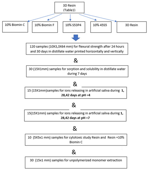 After removing the samples from the printer, they were placed in an isopropyl alcohol solution and washed ultrasonically for 10 min. Then they were cured in a light chamber (Evicrobox, SpofaDental, Jicin, Czech Republic) for 30 min. The support structures were removed with a prosthetic micromotor, and the uneven edges were polished with 30-micrometer grit paper. The scheme of execution of all samples of the tests carried out is presented in Figure 1.