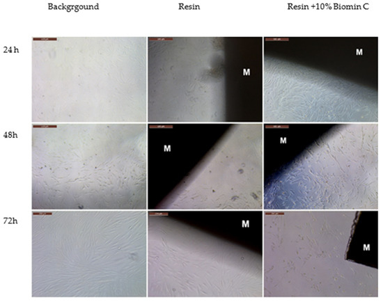 The biocompatibility assay on human gingival fibroblasts (HGFs) from the primary culture after 24, 48 and 72 h of incubation (magnification 5 or 10×, Leica). M—tested material. (The brown stripe in the upper left corner = 500 µm).