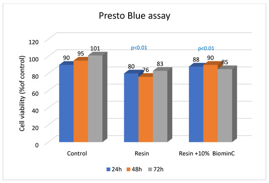 Cell viability after 24, 48 and 72 h of application of the test samples of resin and resin +10% Biomin C was >70% (Figure 5).
