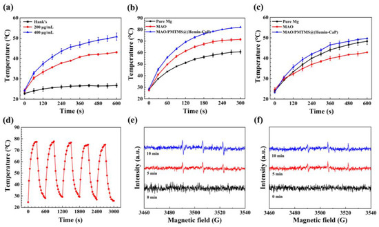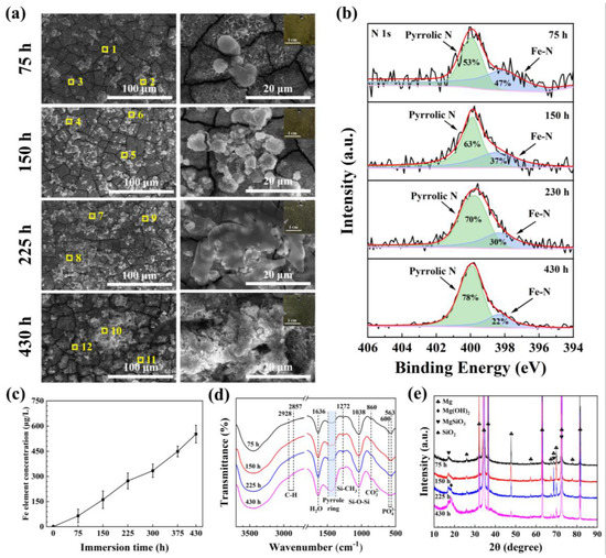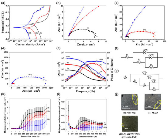 - After the sample is immersed in Hank’s solution, the microspheres adsorbed on the surface of the MAO/PMTMS@(Hemin-CaP) coating will be continuously degraded. As the flake structures covering the microspheres disappear, the exposed hemin nuclei and the demetallation of hemin will facilitate the occurrence of galvanic corrosion. Since PMTMS acts as a physical barrier, the hydrogen evolution of the sample is not obvious in the early period of immersion.