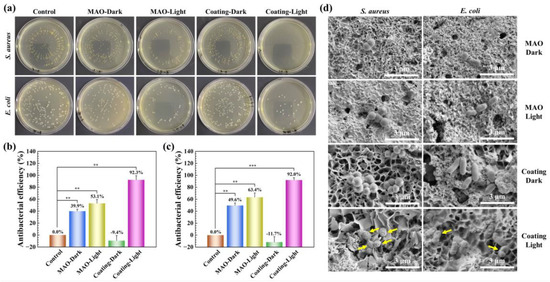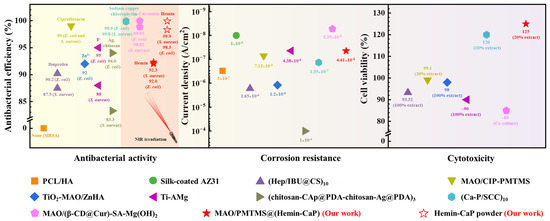 - By virtue of the photothermal and photodynamic performance of the Hemin loaded by microspheres, the antibacterial efficiency of the MAO/PMTMS@(Hemin-CaP) coating against S. aureus and E. coli under 808 nm NIR irradiation is 92.3% and 92.0%, respectively.