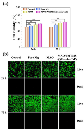 - The MC3T3-E1 pre-osteoblasts cultured in the 72 h extracts prepared with the MAO/PMTMS@(Hemin-CaP) coating exhibit a broadly healthy fusiform-like shape and display a high degree of spreading regarding morphology. The cell viability is 125%, indicating a positive effect of the coating in promoting bone growth, which is promising for application as bone implants.