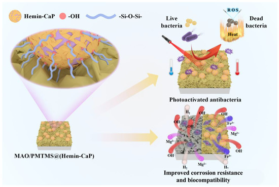 - The MAO/PMTMS@(Hemin-CaP) coating appears as flower-like structures and a cluster of microspheres distributed on the coating surface via physical adsorption. The icorr of the MAO/PMTMS@(Hemin-CaP) coating (4.41 × 10−8 A·cm−2) is two orders of magnitude lower than that of pure Mg (3.12 × 10−6 A·cm−2), indicating the composite coating can provide excellent corrosion protection. Flaky CaP and PMTMS act as physical barriers, restrict the release of Fe3+ ions and prevent the penetration of the corrosion medium, alleviating galvanic corrosion of the Mg substrate.