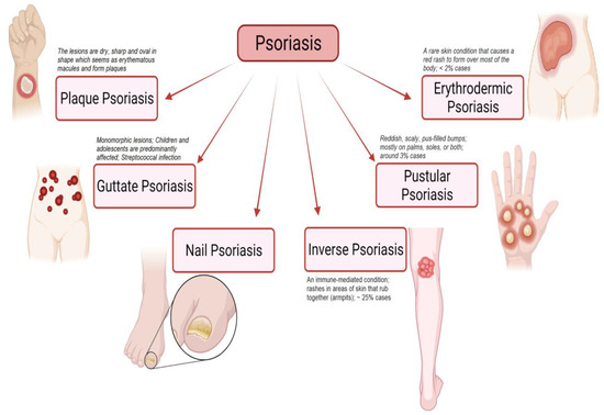 Psoriasis is a non-contagious autoimmune skin disorder characterized by inflammatory conditions of reverting occurrence with erythematous scaly skin lesions and hyperkeratosis plaques [1,2,3]. Psoriasis appears on the skin as patches due to the pile-up of skin cells on the surface of the skin. The International Federation of Psoriasis Association reported that psoriasis affects 2 to 3% of the world’s population [4]. The chronic effect of psoriasis can develop psoriatic arthritis in 10–30% of the cases [4]. Psoriatic arthritis is inflammatory arthritis leading to erosions of articulate cartilage and consequently sustained inflammation results in irreversible joint destruction. The American Academy of Dermatology has classified psoriasis based on the extent of an inflammatory process, patient’s severity, and rash localization as plaque psoriasis (psoriasis vulgaris), eruptive psoriasis, pustular, and erythrodermic (exfoliative psoriasis), and inverse psoriasis or intertriginous psoriasis (illustrated in Figure 1) [2,5,6]. Around 80% of the psoriatic populations are affected by the plaque psoriasis type exhibiting itchy and painful red skin lesions with silvery scales that can be noticed on all body parts including the oral cavity and genital organs [7,8,9]. Based on the degree of psoriasis coverage extent on the body, The National Psoriasis Foundation defines psoriasis as mild, moderate, and severe where psoriasis affecting less than 3% of the body, 3% to 10% and more than 10%, respectively [7]. Moreover, the influence of psoriatic lesions on a patient’s quality of life is also used as a basis to quantify the severity of psoriasis. The abstruse impact has been experienced by moderate to severe psoriasis patients on the quality of their everyday life.