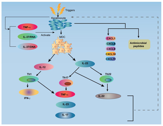 The high level of tumor necrosis factor (TNF) and inducible nitric oxide synthase (iNOS) is expressed by CD11c+ DCs in psoriatic lesions [18,21,23,24,25]. Furthermore, CD11c+ DCs also produces cytokines IL-20 and IL-23, which in turn, potentially activate the keratinocytes and T cells, respectively [18,23,24,25]. The activation of keratinocytes by tissue necrosis factor α (TNFα) and interferon γ (INFγ) leads to the secretion of different types of cytokines (MCP-1, IL-8, CXCL1, CXCL2, CXCL3, CCL20, CXCL9, CXCL10, CXCL11), these cytokines attract many leukocytes (monocytes, neutrophils, PDCs, CCR6+, Th1, CXCR3+, Th1) from the systemic circulation to the skin area [1,17,21,22]. Further, these cytokines participate in amplifying and maintaining the inflammation response that provokes lesions. Interleukin 17 (IL-17), interleukin 22 (IL-22), and INFγ are involved in abnormal proliferation and epidermal hyperplasia [1,21,22,26]. Another important factor responsible for triggering the psoriatic lesion is the production of interferon-α (INF-α) from BDCS-2+ CD123+plasmacytoid DCs [21,27]. DC-LAMP or CD83 represent fractional maturation markers for CD11c+DCs and function as conventional DCs in terms of presenting antigens to T cells for the triggering of the acquired immune response [21,23]. Cytotoxic T cells (CD8+ T) have a great source of pro-inflammatory cytokines (INF-γ), IL-13, IL-22, and IL-17) [1,28]. IL-13 induces the expression of CCL22 in keratinocytes and matrix metalloproteinase-9 activation, leading to the migration of leukocytes into the epidermis [1,29,30].