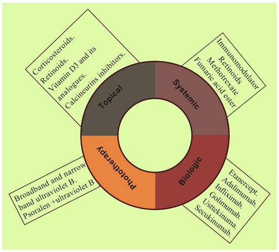 At present, there is no ideal pharmacotherapy for the complete cure of psoriasis. The present treatment option primarily aims to subside the symptoms and avert the disease progression and improve the patient’s quality of life. The available treatment options in the management of psoriasis include calcineurin inhibitors, vitamin D3 analogues, keratolytic agents, corticosteroids, retinoids, and biologics. The available pharmacotherapy and its applications as topical, systemic, and phototherapy in the management of psoriasis are illustrated in Figure 3.