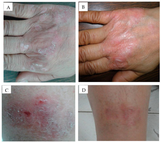 Application of anthralin-loaded liposomal gel (A) before application and (B) after 3 weeks application and ethosomal gel formulation, (C) before application, (D) after 3 weeks application has shown significant improvement in psoriatic signs and symptoms in a clinical investigation. Reproduced from [104], MDPI, 2020.