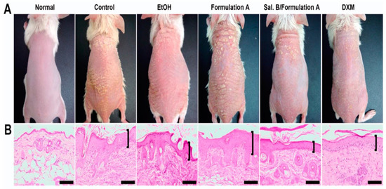 (A) Salvianolic acid B loaded microemulsion system (Sal. B/formulation A) and 0.25% desoximetasone marketed ointment (DXM) improved the sign and symptoms in psoriasis-like dermatitis compared to another treatment group (control group: IMQ-induced psoriatic mice without any treatment; EtOH group: treatment with ethanol in IMQ-induced psoriatic mice; formulation A group: treatment with microemulsion base/vehicle only in IMQ-induced psoriatic mice) after 6 days of treatment. (B) The Sal. B/formulation A and DXM treatment groups exhibited fewer severe clinical and pathological features (epidermal acanthosis, parakeratosis, tortuous capillary dilatation in papillary dermis, and inflammatory cell infiltration) compared to other groups (control group; EtOH group; formulation A group) in a histopathological investigation. Scale bar = 100 μm. Reproduced from [191], MDPI, 2020.