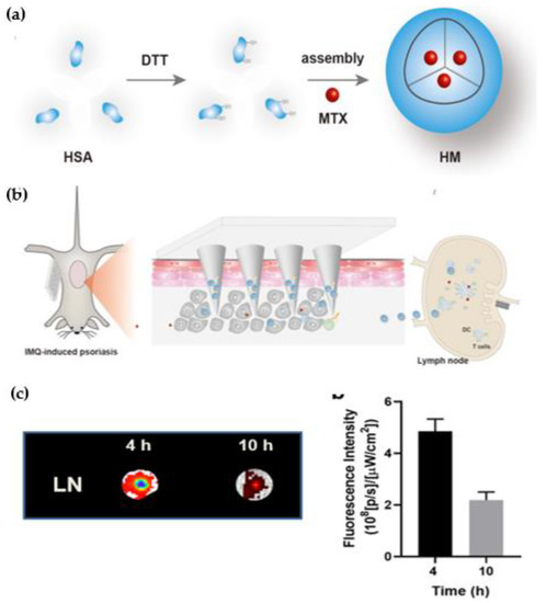 - Wang, H.; Zhao, Z.; Wu, C.; Tong, X.; Shi, Y.; Chen, S. Microneedle Patch Delivery of Methotrexate-Loaded Albumin Nanoparticles to Immune Cells Achieves a Potent Antipsoriatic Effect. Int. J. Nanomed. 2022, 17, 3841–3851. [Google Scholar] [CrossRef]
