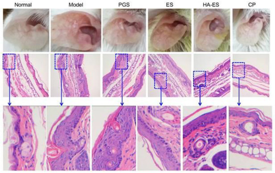 Illustration shows utilization of hyaluronic acid-modified ethosomes (HA-ES) for the delivery of curcumin by active targeting approach to the targeted site in psoriasis through CD44 receptor-mediated drug-delivery approach ultimately helpful to improve the therapeutic efficacy of curcumin compared to non-targeted ethosomes system (ES). Normal: No treatment; Model: Treated with imiquimod only to induce psoriasis; PGS: Treated with curcumin in propylene glycol solution; ES: Treated with curcumin-loaded ethosomes; HA-ES: Treated with curcumin-loaded hyaluronic-modified ethosomes; CP: Treated with clobetasol propionate marketed cream. Reproduced from Zhang Y et al. [220], Ivyspring International Publisher, 2019.