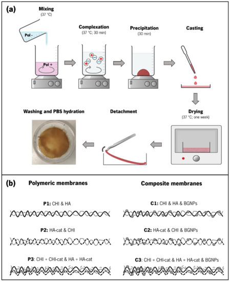 The next stage consisted of incorporating BGNPs as part of the membrane composition. This was achieved by mixing them in the polycation solution. In this case, we reduced the polycation mass to accommodate a similar BGNP mass reported in a previous study [18]. The CoPEC membrane nomenclature adopted for this study is displayed in Table 1, where “P” stands for polymeric and “C” stands for composite.