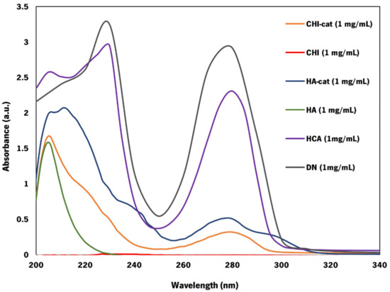 UV-vis spectra of CHI, HA, CHI–cat, HA–cat, HCA, and DN (λ = 200–320 nm). The absorbance is presented in arbitrary units. (CHI was dissolved in a 0.15 M NaCl solution (1.5% (v/v) acetic acid solution as solvent), and CHI–cat, HA, HA–cat, HCA, and DN were dissolved in a 0.15 M NaCl solution).