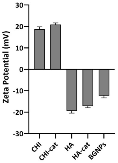 The charge of the polyelectrolytes is the most important parameter for synthesizing polyelectrolyte complexes. Considering distinct possible compositions of CoPEC membranes, we studied the ζ-potential of the polyelectrolytes CHI/CHI–cat and HA/HA–cat as well as the BGNPs. As seen in Figure 3, both CHI and HA were confirmed as weak PEs having the expected positive and negative charges, respectively [26]. The charge of the catechol conjugates did not vary significantly from their unmodified polymers given the aforementioned low modification percentage. As for the BGNPs, they presented a ζ-potential of −12.3 ± 1.03 mV. With this value, attraction forces are stronger than the repulsion, which suggests they will have the tendency to form aggregates [27].