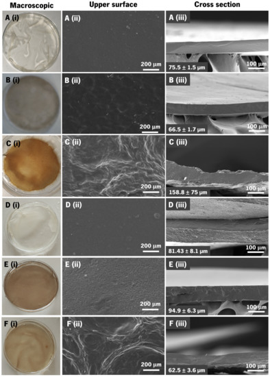 Macroscopic and microscopic views of the produced CoPEC membranes (A—P1; B—P2; C—P3; D—C1; E—C2; and F—C3): (i) Representative photographs in a hydrated state inside a Petri dish (diameter = 5 cm); (ii) SEM micrographs of membranes’ surfaces; and (iii) SEM micrographs of their cross-sections and respective estimated thickness in the dry state (values are means ± standard deviation).