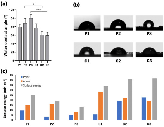 Surface energy (SE) values were also measured (Figure 5c), and the SE of the composite membranes was generally higher than their polymeric counterparts. The polar component was the major contributor, particularly for C2 and C3. Their higher SE might suggest that they could promote suitable cellular attachment. In particular, the polar component was higher than 15 mN.m−1, which has been associated with marked cell spreading behaviors [34].
