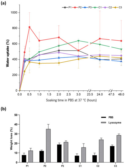 Swelling and degradation studies of the CoPEC membranes. (a) Water uptake of the CoPEC membranes in PBS solution for 48 h at 37 °C; (b) Weight loss of the CoPEC membranes after soaking in PBS and in a PBS–lysozyme enzymatic solution for 31 days at 37 °C.