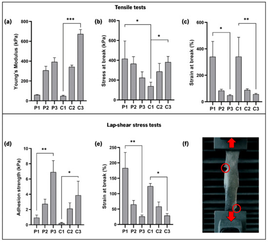 Tensile and lap-shear stress tests of the CoPEC membranes and the various measured parameters. (a) Young’s modulus; (b) Stress at break; (c) Strain at break; (d) Adhesion strength; (e) Strain at break (lap-shear); (f) Representative picture of a lap-shear stress test with a CoPEC membrane showing self-healing and the rupture points highlighted in red circles. Significant differences were found for p < 0.05 (*), p < 0.01 (**), and p < 0.001 (***).