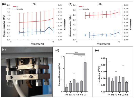 DMA measurements of the CoPEC membranes: Variation of the storage modulus and loss factor along a frequency scan ranging from 0.1 to 10 Hz in PBS solution at 37 °C for P3 (a) and C3 (b); (c) Experimental setup; mean values obtained at physiological frequency (1 Hz) for: (d) Storage modulus and (e) loss factor. Significant differences were found for p < 0.0001 (****).
