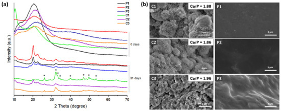 In vitro mineralization study: (a) XRD spectra of the CoPEC membranes before and after immersion in SBF for 31 days (reference hydroxyapatite peaks are indicated as *); (b) SEM micrographs of CoPEC membranes’ surface after immersion in SBF for 31 days. Scale bars represent 5 µm.