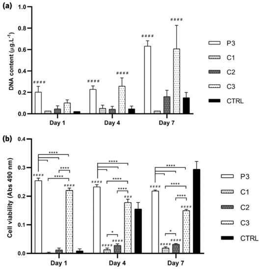 Cellular assays. (a) DNA quantification using the PicoGreen assay; (b) Cellular viability analysis using the MTS assay. SaOs-2 cells cultured on the P3, C1, C2, and C3 membranes in D-MEM for one, three, and seven days. TCPS was used as a control. Significant differences were found for p < 0.05 (*) and p < 0.0001 (****). Significant differences between membrane conditions with the control (CTRL) are represented as (#).