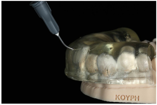 Additional published concepts have been based on the idea of constructing direct composite veneers via matrices. In two articles, Terry et al. described the resin composite injection technique, which mainly focuses on the rehabilitation of the anterior teeth. The restorative concept included the construction of a clear polyvinyl siloxane matrix by replicating the diagnostic wax-up using a nonperforated tray. After the curing of the matrix material, small openings are made in the middle of the incisal edge for the injection of the flowable resin composite (Figure 1). Before the application of the adhesive protocol to one tooth buccal and lingual surfaces, the adjacent teeth are separated using teflon tape. After the adhesive procedure, the matrix is placed over the anterior teeth and the flowable resin composite is injected through the opening above the tooth to be restored. Light curing takes place and, after the removal of the matrix, the last step is the finishing and polishing of the restoration. The same procedure is repeated for the restorations of the adjacent teeth. This treatment concept has been suggested to restore anterior fractured teeth, class III and IV cavities, composite veneers and pediatric composite crowns. Furthermore, the injection technique is useful for space-closing after orthodontic treatment, the fabrication of tooth- and implant-supported provisionals, and the restoration of fractured or missing denture teeth. In addition, the workflow can be used to restore worn occlusal surfaces of the posterior teeth [15,16]. This restorative concept, which is described above, has quickly become very popular among operative dentists all over the world. Some have published cases treated using this technique [17,18,19,20], and others applied the technique and suggested some modifications.