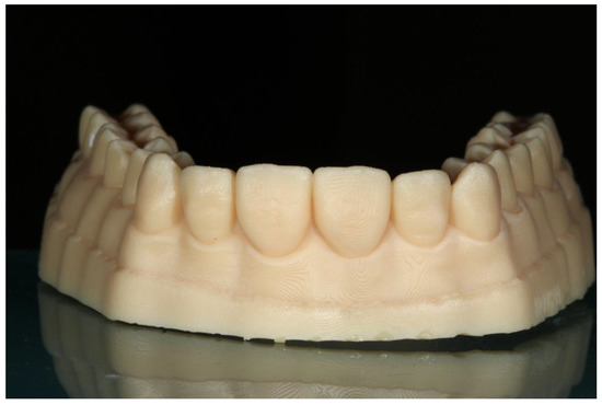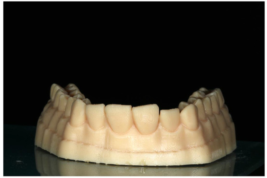 For the purpose of the experiment, a unique plastic model with six misaligned anterior teeth (Dentalstore, Milano, Italy) was used to simulate a clinical case to be restored. The model was scanned with a laboratory scanner (3Shape E3, Copenhagen, Denmark). According to the manufacturer, the accuracy level was approximately ±7 μm. Then, the first cast was printed using a 3D printer (Asiga Max UV, Sydney, Australia) (Figure 4) with 62 μm pixel resolution and 100 μm layer thickness, according to the manufacturer. The casting material was the 3D printer resin Optiprint Model, in golden brown color (Dentona, Dortmund, Germany).