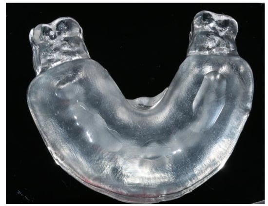 The 3D-printed casts that made up the control group were used for index construction. In an attempt to eliminate the effect of the matrix’s thickness on the final restorations, a clear tray designed in EXOCAD was 3D printed (Figure 7). The tray was designed to ensure a uniform matrix thickness of 6 mm. A study regarding the effect of silicone thickness on the Shore hardness of elastomers showed that the thickness should be at least 6 mm [25].