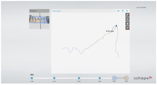 After the completion of the direct veneers of the four research groups, the specimens were scanned using the lab scanner and STL files were created. Those STL files were imported to the patient monitoring software (TRIOS Patient Monitoring) for data analysis. The superimposition process was used based on the unrestored posterior teeth’s surfaces using three-point alignment. Best fit alignment was not used since it produced significantly higher alignment errors compared to the three-point alignment [26]. The three points selected were on teeth #14, #17, and #26. By choosing the color-coded 3D map, it was possible to verify the precise alignment of the two models. The posterior teeth had to be totally green, which meant differences between the models smaller than 0.30 mm (Figure 8). Then, the width of the tooth was measured and a cross-section plane was vertically set to the labial surface and at the buccal-lingual direction, exactly in the middle of each anterior tooth (#13–23). At the tooth profile cross-section window, the contour tracings of the teeth were automatically carried out by the software and linear measurements of the aligned models were taken (Figure 9). This procedure has been previously published by Moldovani et al. [27]. Three measurements for each tooth were made at the labial surface: incisal, middle and cervical. Finally, 1080 measurements were made. Three on every anterior tooth (#13–23) for twelve models or each of the five groups. According to the manufacturer, the measurement uncertainty was 50 μm when the scans were materialized by using the intra oral scanner.